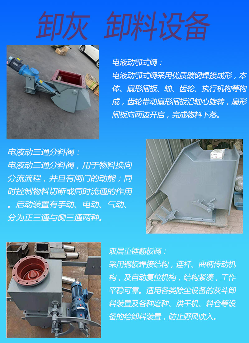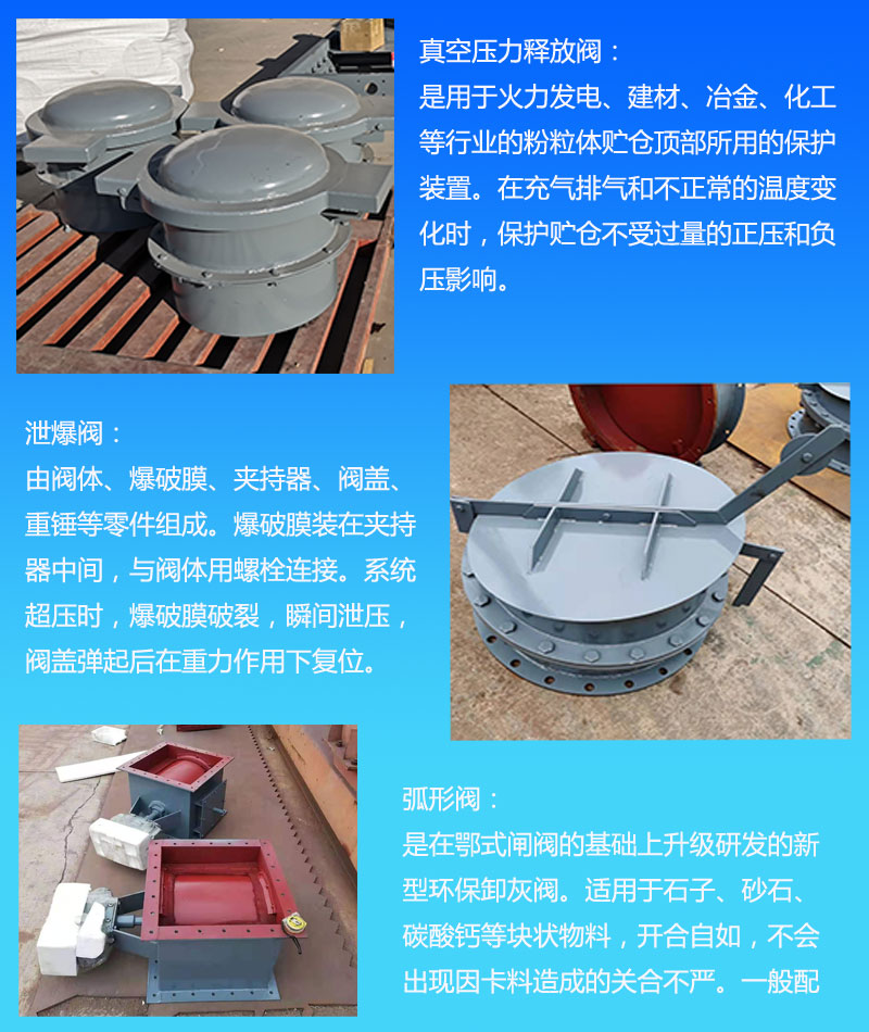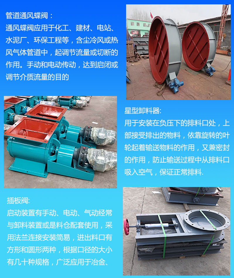 弧形阀、刮板机、厂双层、手动刀、正压星、链条斗、双向压、防卡星、粉空气、扇形阀、调节阀、鸟笼子、异型阀、圆口星、卸料机、下料阀、输送机、百叶阀、拆卸星、315空气、挡板门、铸铁星、拉链机、防爆星、制砂机