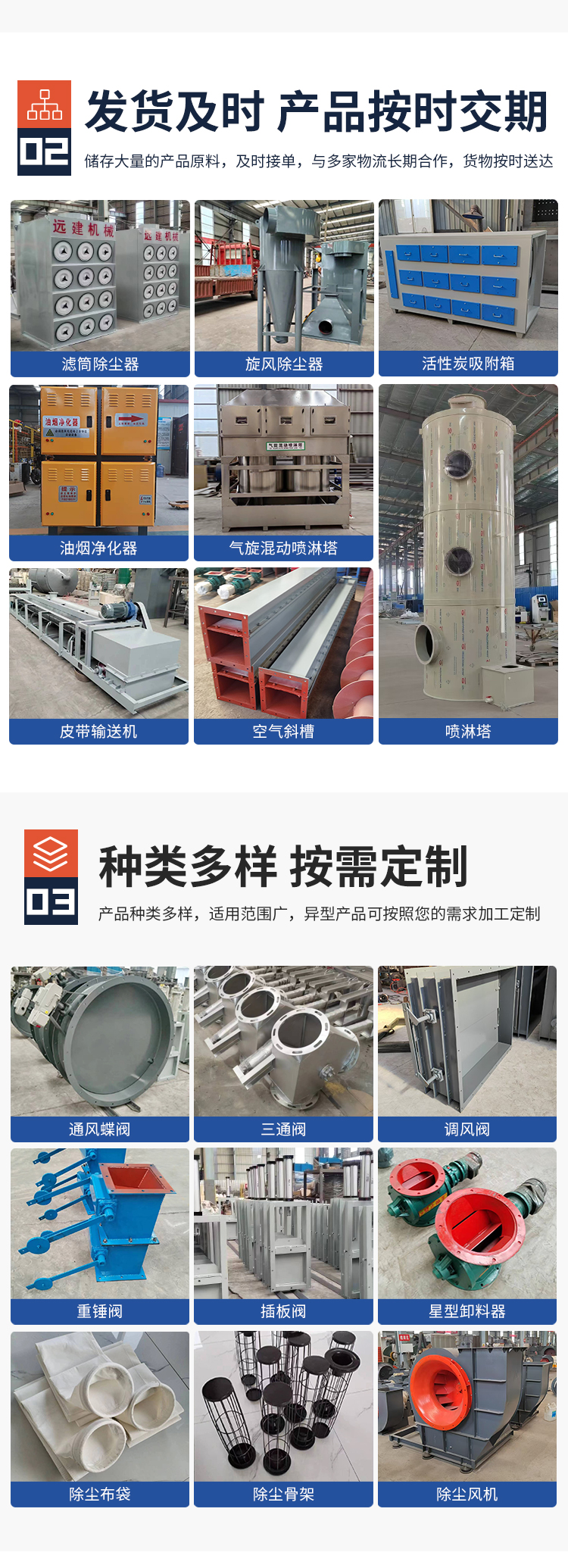 除尘器、U型螺旋输送机、插板阀、单轴加湿搅拌机、斗式提升机、刮板输送机、管式螺旋输送机、空气斜槽、双轴加湿搅拌机、吸料设备、污水处理一体化、气浮机、催化燃烧、散装机、料封泵