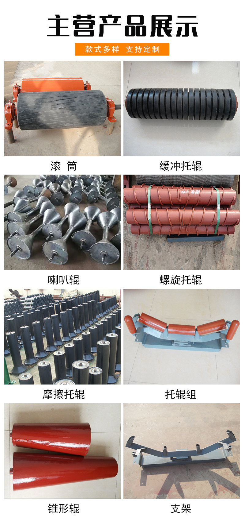 喇叭辊、皮带机、输送机、动力滚筒、螺旋托辊、喇叭托辊、传动包胶、锥形托辊、橡胶滚筒、皮带滚筒、平行包胶、托辊支架、电动滚筒、清洗包胶、缓冲托辊、皮带托辊、铸胶滚筒、钢筋盘绕、面传动滚筒、输送带托辊、下调心托辊、缓冲支架槽、矿用托辊组、缓冲橡胶托辊、矿用平行托辊