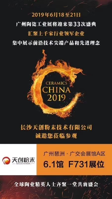 Ceramics China 2019第33届广州陶瓷工业展定于6月18-21日在广州广交会展馆A区举行。粉体设备制造商-长沙天创粉末技术有限公司应邀参加,天创粉末与您相约广州广交会展馆6.1馆,F731展位。