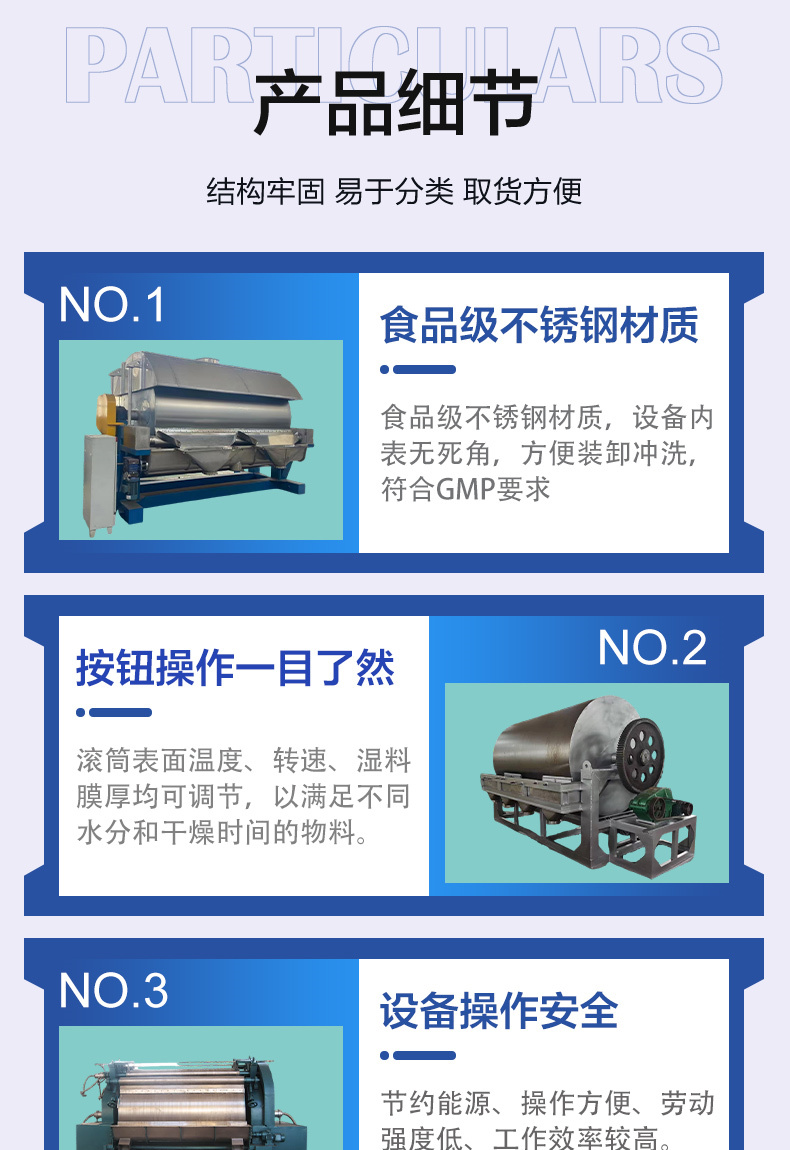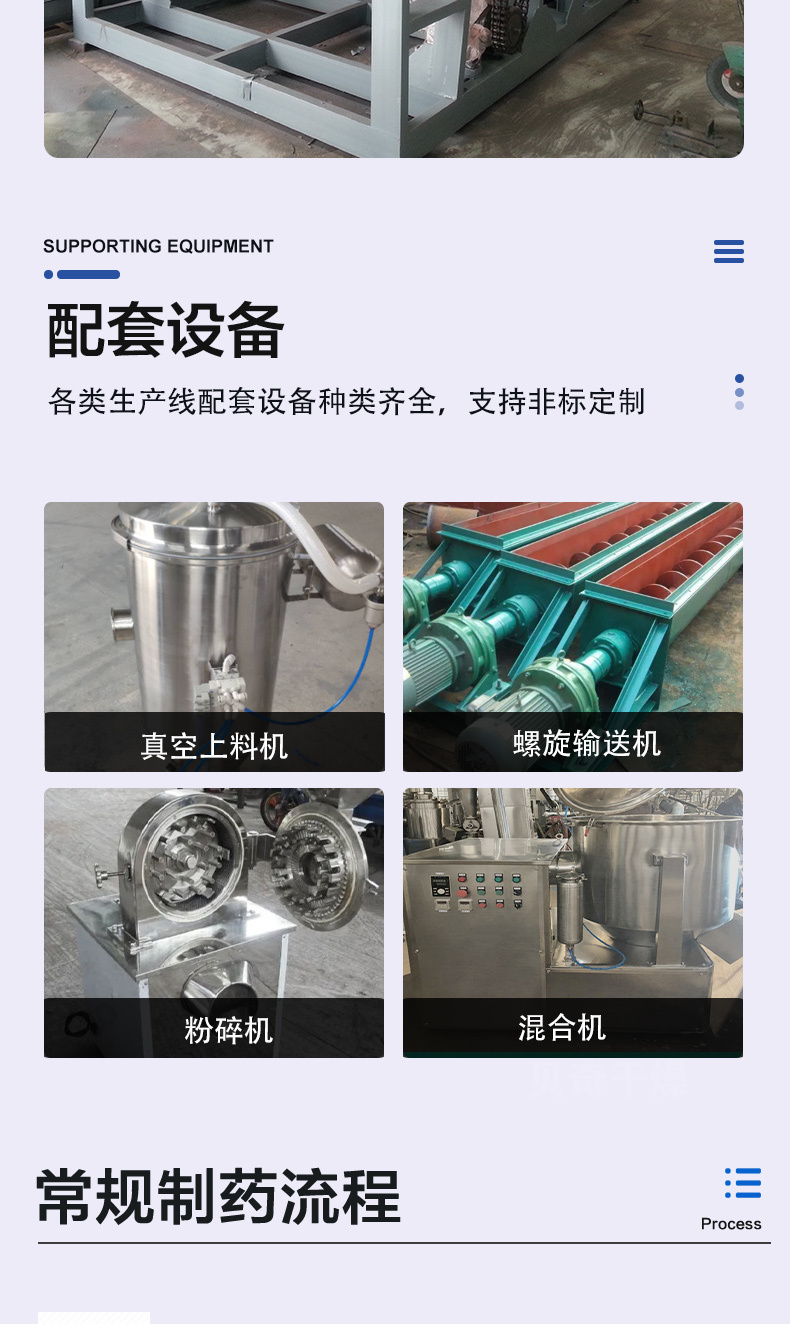 双锥回转真空干燥机、耙式干燥机、盘式干燥机、闪蒸干燥机、喷雾干燥机、带式干燥机、桨叶干燥机、高效沸腾干燥机、振动流化床、滚筒刮板干燥机、沸腾制粒机、湿法制粒机、热风循环烘箱、三维混合机、二维混合机、方形真空干燥机、V型混合机、旋转制粒机