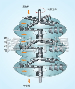 湿物料自加料器连续地加到干燥器上部**层干燥盘上,带有耙叶的耙臂作回转运动使耙臂作回转运动使耙叶连续地翻抄物料。物料沿指数螺旋线流过干燥盘表面,在小干燥盘上的物料被移送到外缘,并在外缘落到下方的大干燥盘外缘,在大干盘上物料向里移动并从中间落料口落如下一层小干燥盘中。大小干燥盘上下交替排列,物料得以连续地流过整个干燥器。中空的干燥盘内通入加热介质,加热介质形式有饱和蒸汽、热水和导热油,加热介质由干燥盘的一端进入,从另一端导出。已干物料从*后一层干燥盘落到壳体的底层,*后被耙叶移送到出料口排出。湿份从物料中逸出,由设在顶盖上的排湿口排出,真空型盘式干燥器的湿气由设在顶盖上的真空泵口排出。从底层排出的干物料可直接包装。通过配加翅片加热器、溶剂回收冷凝器、袋式除尘器、干料返混机构、引风机等辅机,可提高其干燥的生产能力,干燥膏糊状和热敏性物