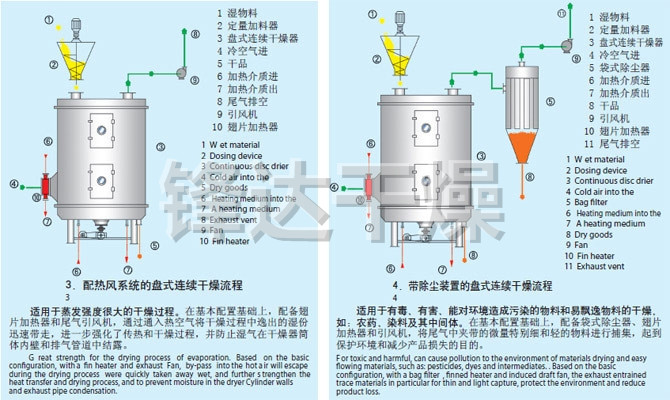 ◎加热介质:蒸汽、热水、导热油、干燥盘温度100℃时使用热水加热,100℃~150℃时用≤0.4MPa饱和水蒸汽或者过热蒸汽加热,150℃~320℃时用导热油加热,>320℃时可采用电、导热油、熔盐等方式加热。