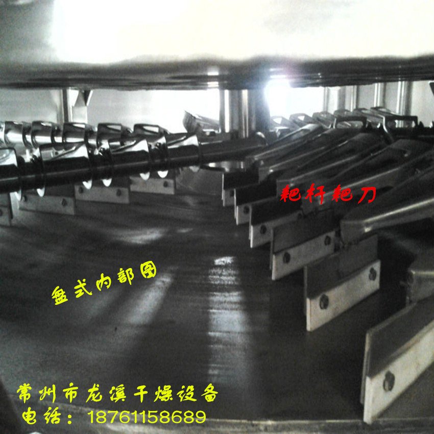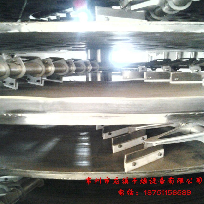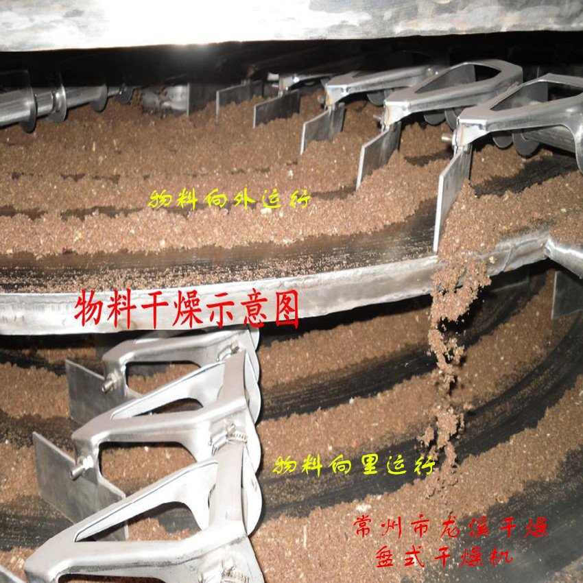 湿物料自加料器连续地加到干燥器上部**层干燥盘上,带有耙叶的耙臂作回转运动,使耙臂连续地翻抄物料。物料沿指数螺旋线流过干燥盘表面,在小干燥盘上的物料被移送到外缘,在大干盘上的物料向里移动并从中间落料口落入下一层小干燥盘中。大小干燥盘上下交替排列,物料得以连续地流过整个干燥器。中空的干燥盘内通入加热介质,加热介质形式有饱和蒸汽、热水和导热油,加热介质由干燥盘的一端进入,从另一端导出。已干物料从*后一层干燥盘落到壳体的底层,*后被耙叶移送到出料口排出。湿汽从物料逸出,由设在顶盖上的排湿口排出,真空型盘式干燥器的湿汽由设在顶盖上的真空泵口抽出。从底层排出的干物料可直接包装。通过配加翅片加热器、溶剂回收冷凝器、袋式除尘器、干料返混机构、引风机等辅机,可提高其干燥的生产能力,干燥膏糊状和热敏性物料,可方便地回收溶剂,并能进行热解和反应操作。