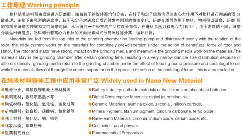 物料随着进料泵由顶端进入研磨腔,随着转子的旋转而均匀分布,在转子和定子缝隙内涡流离心力作用下对物料进行了彻底的预分散处理。在接下来强烈的研磨中,转子和定子对研磨介质连续发生剧烈的撞击变化,研磨介质再作用于物料,物料得以研磨,研磨后的物料在研磨腔停留特定的研磨时间,从而得到一个极窄的产品粒度分布带,在进料泵压力和离心力作用下,由于密度的不同,研磨介质返回研磨腔,物料却沿着离心力相反的方向经滤网式分离器过滤分离,循环往复。