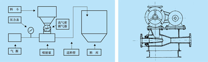 该泵由落料斗、高气密耐磨电动锁气器、喷射泵和其他相关附件连接组成。