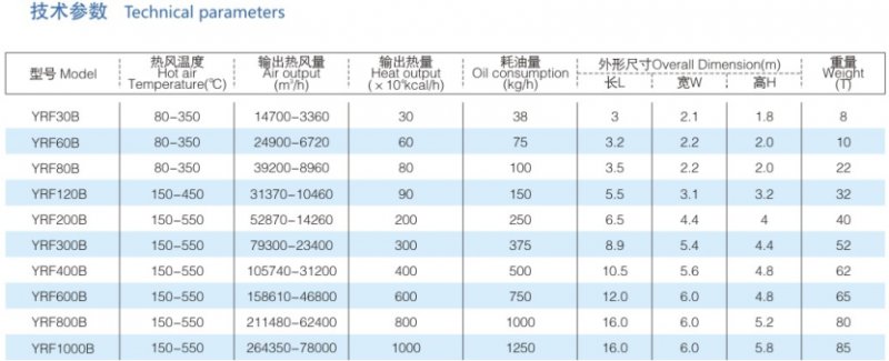YRF-B换热式燃油(气)热风炉:供热量80万千卡/小时以下的炉型,换热室和燃烧室合为一体,材质为耐火砖和20g,供风温度350℃以下;供热量在100-1000万千卡/小时的炉型,换热器和燃烧室为分体结构,换热器材质问20g,供风温度350℃以下,换热器材304,供应温度550℃,换热器材310S,供风温度750℃以下。YRF-B换热式燃油(气)热风炉热效率>80%,排放达标。
