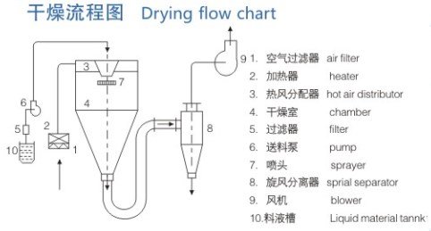 空气通过过滤器 "1" 和加热器 "2" 进入干燥室顶部的热风分配器 "3",热空气呈现螺旋状均匀地进入干燥室 "4"。料液经过过滤器 "5",由泵 "6" 送至在干燥室顶部的离心喷雾头 "7",被喷成极小的雾状液滴,以极大的表面积与热空气接触,水份迅速蒸发,在极短的时间内干燥成颗粒制品,在塔底和旋风分离器 "8" 中捕集,湿废气由风机 "9" 排至室外。(见干燥流程图)。