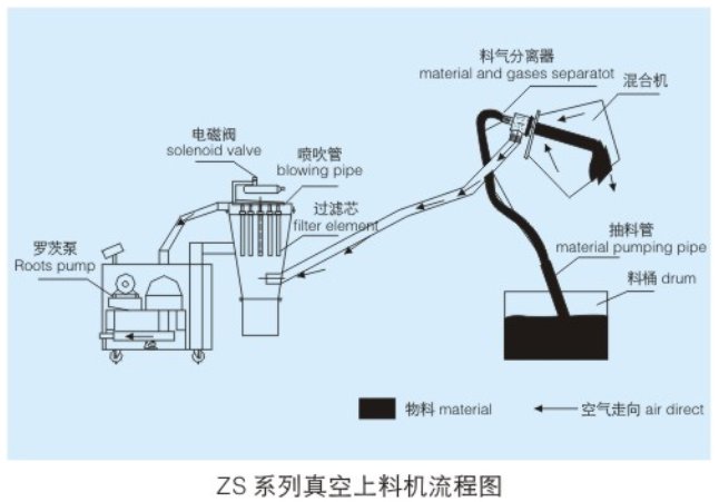 ■ZS型系列真空上料机是我公司新型开发研制的新型真空上料机,负压的形成是由罗茨风泵。其负压值可达4000PA以上,粉尘的过滤由新型滤芯完成,过滤精度可达10μm,并设有压缩空气反吹系统。