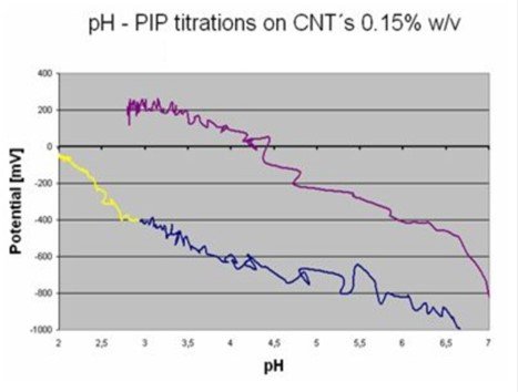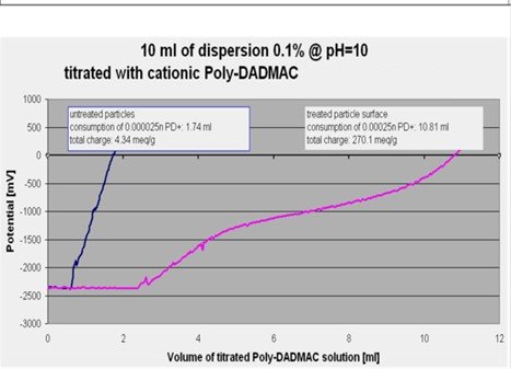 在Stabino II ®中,离子电荷密度还可以通过聚电解质滴定至达到零电位点来确定。因为CNT表面自然带负电,因此滴定通过添加阳离子聚合物来操作。1N的阳离子聚电解质(PD)带有1eq的电子电荷。假设电荷补偿是1:1,那么聚电解质(PD)的消耗量就可以测量每克样品总的电荷。