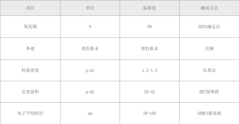 1纳米氧化铜粉通过高频等离子体气相燃烧法制备,产品纯度高,粒径小,分布均匀,比表面积大,高表面活性,松装密度低,气相法制备,克服了市场上湿化学法制备的颗粒硬团聚、难分散、纯度低等缺点;2溶于稀酸等,不溶于水,在醇、氨溶液中溶解缓慢。高温遇氢或一氧化碳,可还原成金属铜;
