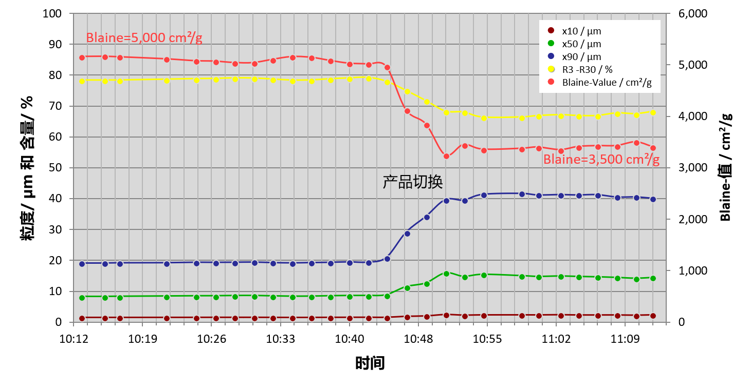 在连续的生产过程中MYTOS可以实时监测,参与粉磨控制,以保证质量稳定。在进行产品切换时,在线控制技术可完成快速转换。由此,生产企业就无需专门设置一个料仓用来储存在产品切换时所产生的中间不合格产品,节约成本。