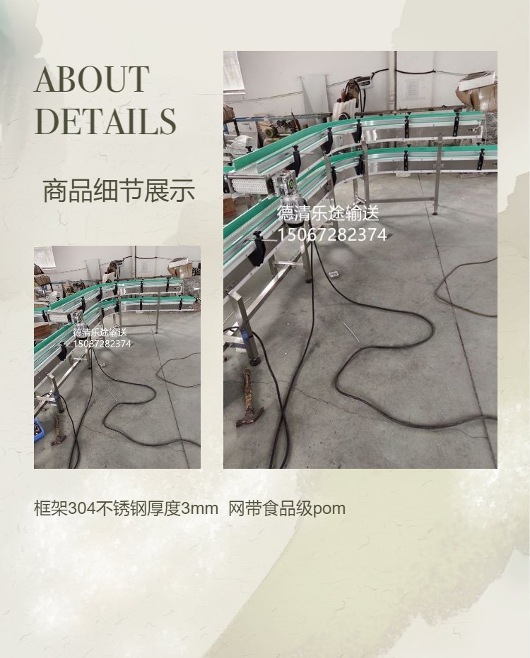 <br/><p align="left" style="color: #333;background-color: #FFF;font-family: null;font-size: 16px">机架:201/304不锈钢,碳钢喷塑(颜色有冰灰,红色,绿色,白色等),铝合金,碳钢镀硬铬/装饰铬,<br/><br/>镀锌,喷漆等 lt;br/><br/>网带:不锈钢、碳钢、塑钢<br/><br/>节距:25.4mm<br/><br/>辊筒所用轴承:6001zz、6002zz? 6204zz<br/><br/>辊筒所配链轮:12T ?9T ?15T 等等<br/><br/>底脚:有脚轮,可调杯脚 lt;br/><br/>辊筒安装方式:内螺纹安装,弹簧安装等,扁榫安装<br/><br/>电机功率:0.2-5.5kw<br/><br/>输送速度:可以根据客户要求定速或者变频调速、无极调速等 lt;br/><br/>载重:可以根据客户要求制作 lt;br/><br/>使用场合:食品加工厂,物流中心,医药厂、涂装设备厂等等<br/><br/>联系地址:浙江湖州德清乾元城北村开封寺14 号<br/><br/>联系电话:0572—8427578<br/><br/>传真号码:0572—8427578<br/><br/>手机:15067282374<br/><br/>邮箱:zjloto@163.com<br/><br/>联系人:滑德布<br/><br/>乐途网址: http://www.zjloto.com<br/><br/><br/><br/>