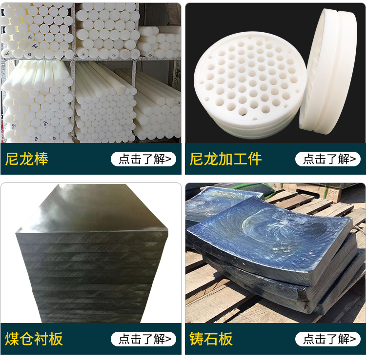 空心管、塔吊配、龙拖轮、电缆线、阻燃板、复合板、尼龙板、异形板、异形件、龙衬套、减震板、捞渣机、仓衬板、耐磨板、除渣机、耐磨条、输送机、尼龙垫、洗碗池、浇铸板、路基板、链条托、豆腐板、垫脚板、起重机