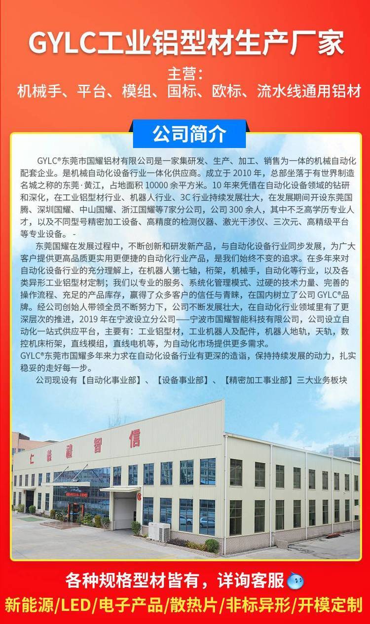 铝型材、设备框、防护罩、机器人、鱼缸架、轴承座、铝材挤压、机箱外壳、机械手模、数控车床、机械零件、铝材框架、检测设备、铝合金型材、物流分拣线、桁架机械手、金属加工材、物流拣货线、直线模组型材