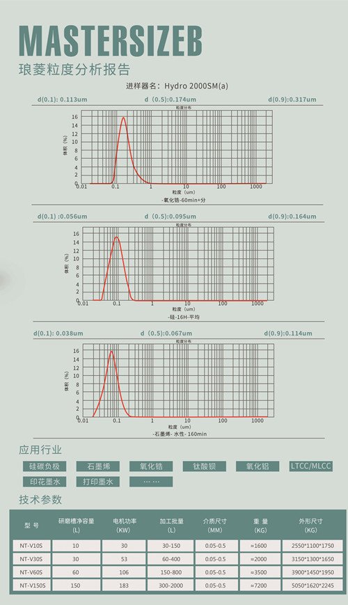 详细信息 双动力离心式纳米砂磨机 NT-VS系列 技术优势: ◎ 无筛网分离 ◎ 物料粒径分布窄 ◎ *小可使用粒径0.05mm研磨介质 ◎ 超细纳米级棒销式高效研磨机型,研磨细度可达100nm以下,物料研磨与物料分离独立运行,研磨更加精细彻底,单位时间内的有效产出是普通砂磨机的2-3倍,广泛应用于纳米新材料、MLCC、锂电、硅碳负极、氧化铝、陶瓷墨水等行业领域。