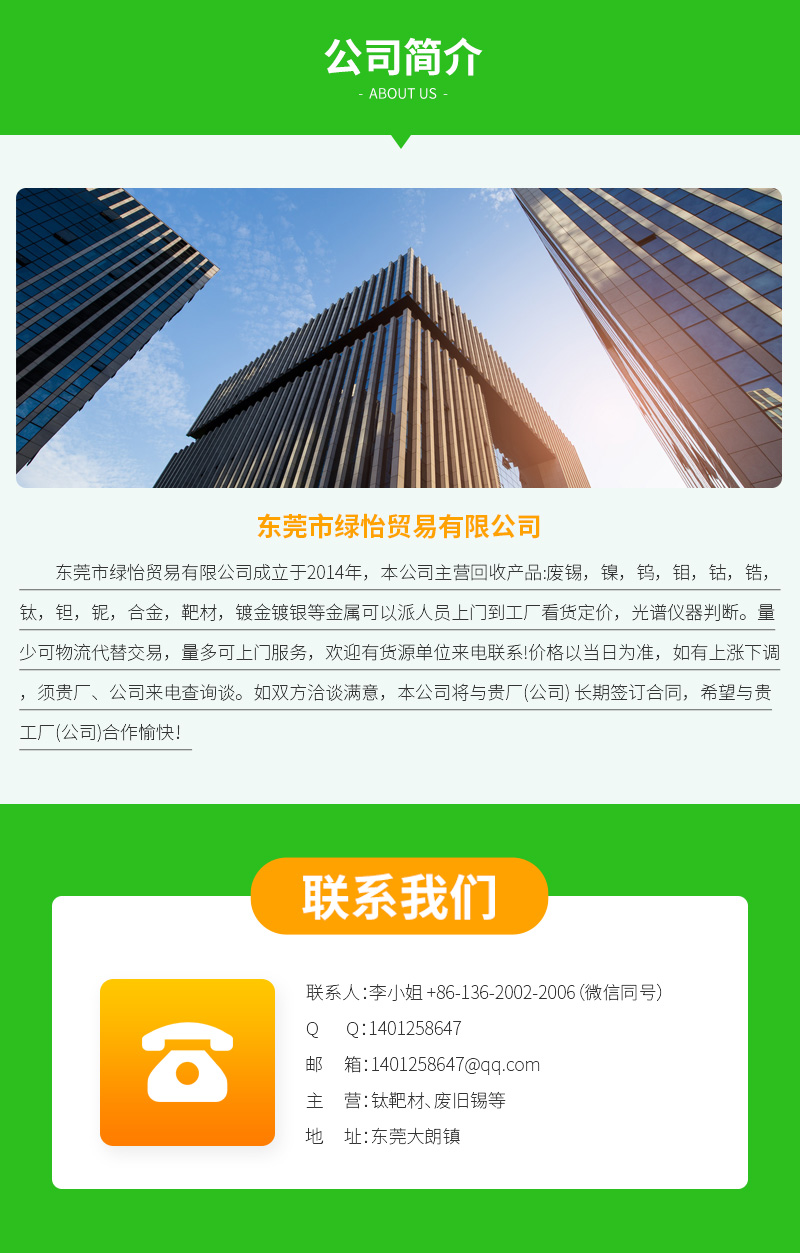 高速钢、钼板坯、废锡膏、挂具钛、钼合金、收废镍、废铣刀、废锡线、pcb钻头、钨电极、线切割、废合金、废铍铜、废旧锡、电渡锡、ito靶材、废镍料、红铜渣、钨钢pcb、合金棒、价镍粉、钛合金、钨合金、钛靶材、含银锡