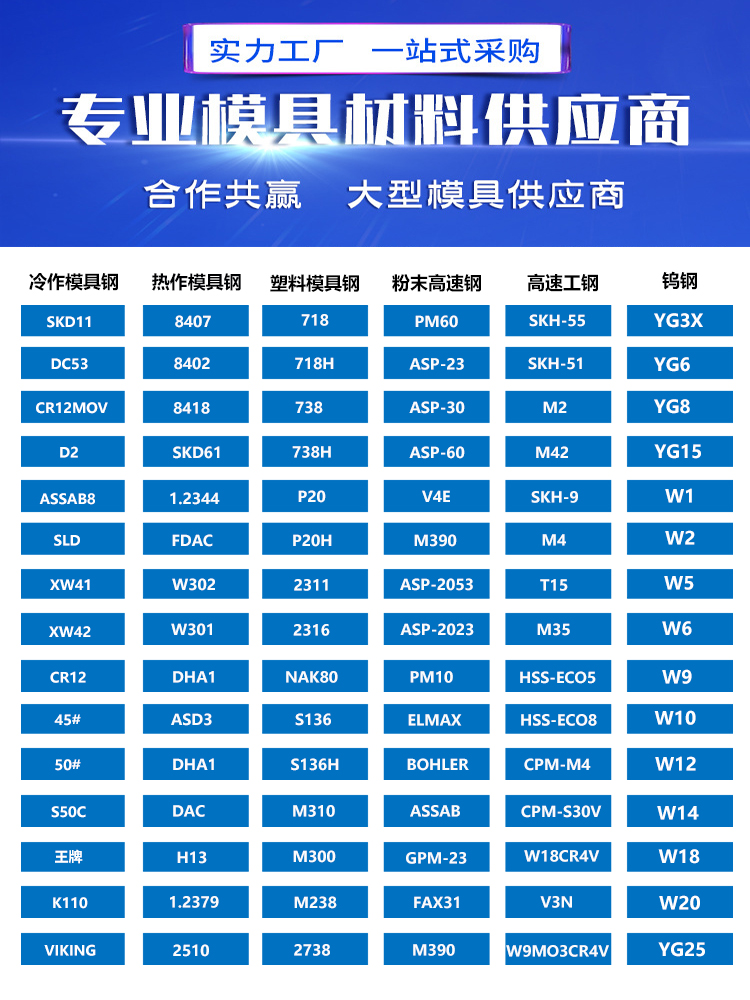 塑胶模具钢、五金模具钢、锌合金、铝合金压铸模、钢材光板、钢材精料、钢材毛料