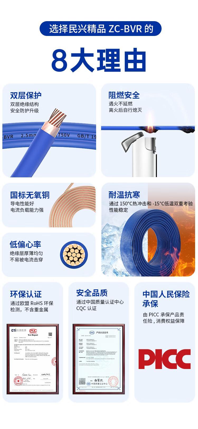 民兴电缆 国标铜芯家用铜线 耐高温ZC-BVR-1.5平方