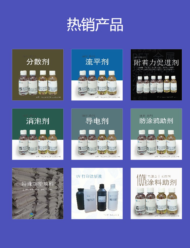 涂料分散剂、流平剂、消泡剂、附着力促进剂、防涂鸦助剂、导电剂、手感剂、增硬耐磨剂、UV打印涂层液、UV玻璃涂层、UV金属涂层、UV PET涂层、UV塑料涂层