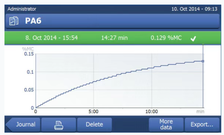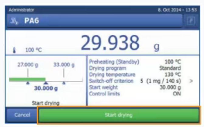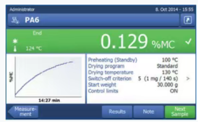 如何使用HX204进行水分测定 1. 点击PA6方法的快捷键 • 分辨率:高 • 待机温度:100°C • 升温程序:标准; -SOC-延迟:5min -干燥温度:130° 2. 样品盘去皮,加入约30g塑料粒子。 3. 点击"开始干燥"开始水分测定。 4. 结果显示塑料粒子的水分含量结果。 结果 使用HX204测定PA6塑料粒子的水分含量结果为0.129%,符合加工工艺中建议的最大极限值0.2%, 因此,无需再对塑料粒子进行干燥,即可启动注塑工艺。