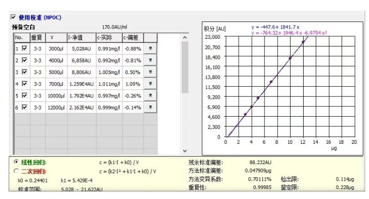 对于较低TOC浓度样品的测定,如何绘制低浓度的标准曲线显得非常重要。由于配制标液需要稀释液,但实验室很难找到TOC为零的稀释液,在配制溶液的过程也容易引入空气中的CO2 ,得不到线性较好的曲线。德国耶拿multi N/C 总有机碳分析仪提供吸取不同体积绘制曲线的功能,无需人为配制曲线,线性轻松达到0.999以上,且校准周期长达一年,减少每次做样前曲线绘制的人力和时间,让您有更多的时间做重要的事情。