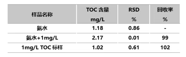 由于氨水是碱性溶液且电子级的氨水TOC浓度本身就比较低,容易吸收空气中的CO2 ,造成结果的不准确性,测试前对样品进行稀释中和,同时扣除酸空白。从实验数据可以看出,样品RSD均小于1%,0.1ppm的样品加标回收率为99%,0.1ppm TOC标样的回收率为102%,说明仪器对低TOC的电子级氨水测定准确性高。