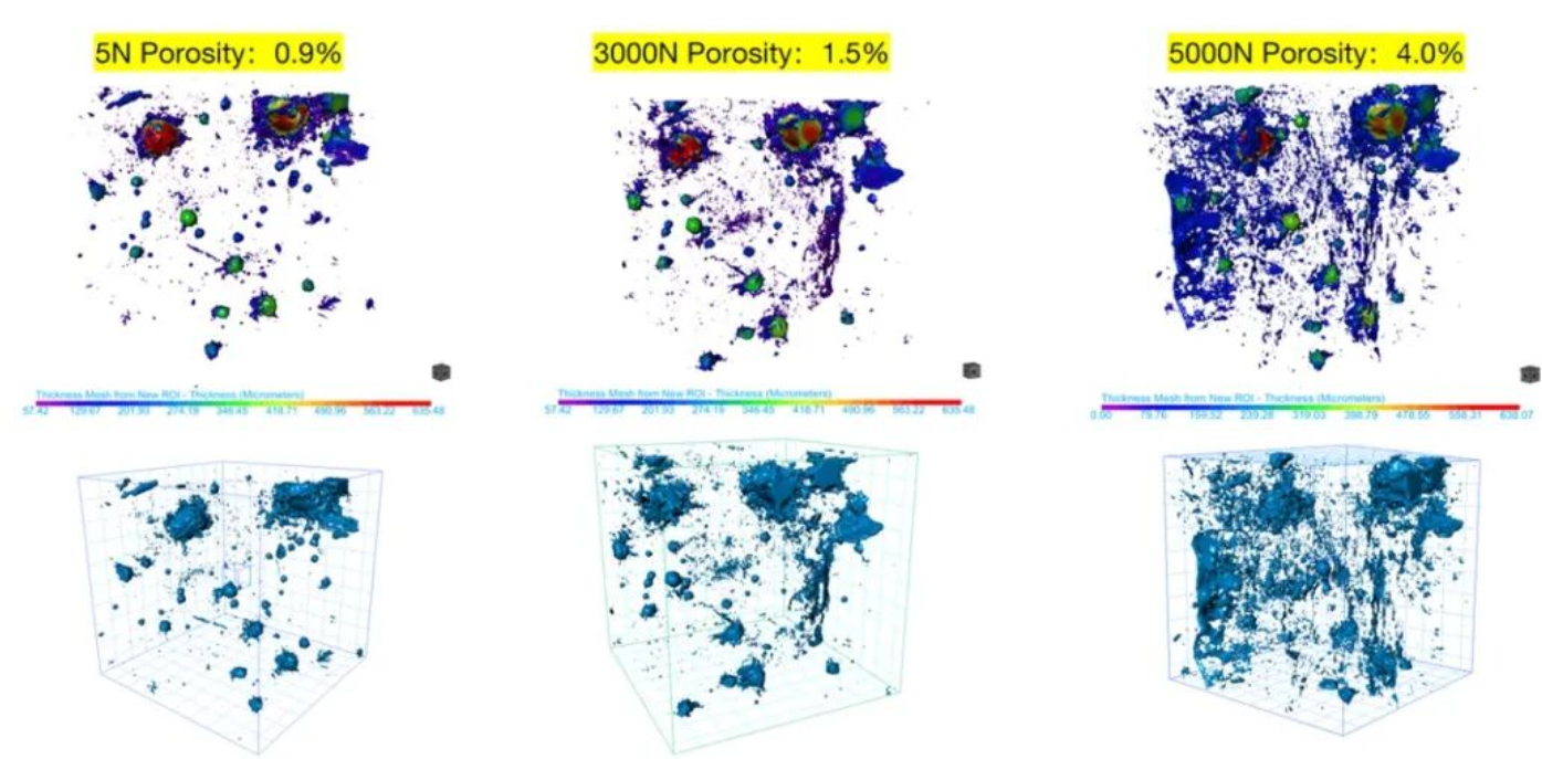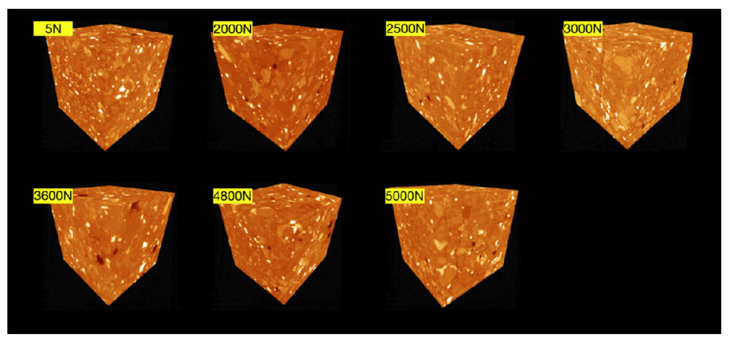 ▲ 图1:压力位移曲线:水泥材料在压力作用下,随着力的增加压缩量的变化(mm) ▲ 图2:不同压力下,水泥材料内部孔隙裂纹结构变化:随着压力的增加,样品内部孔隙裂纹的增加拓展。 ▲ 图3:不同压力下,水泥材料内部结构变化:随着压力的增加,样品内部孔隙裂纹体积占比增加,裂纹拓展。 左右滑动查看更多>>>