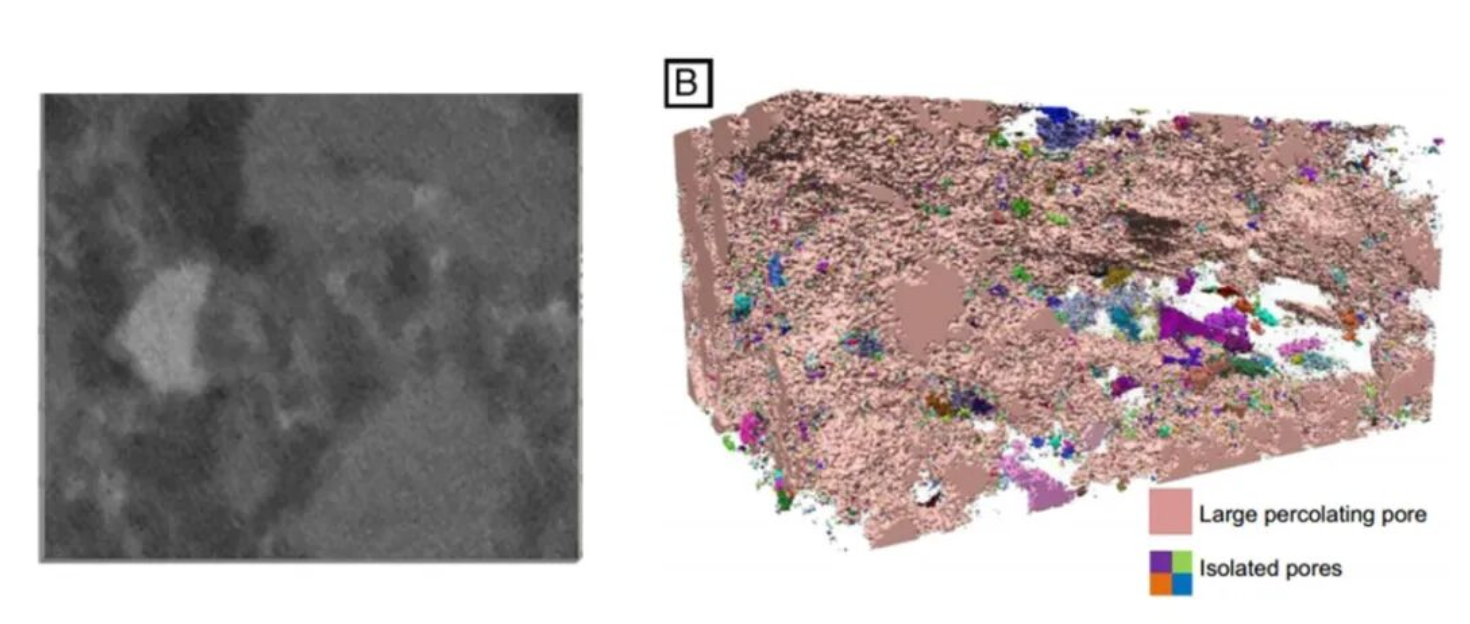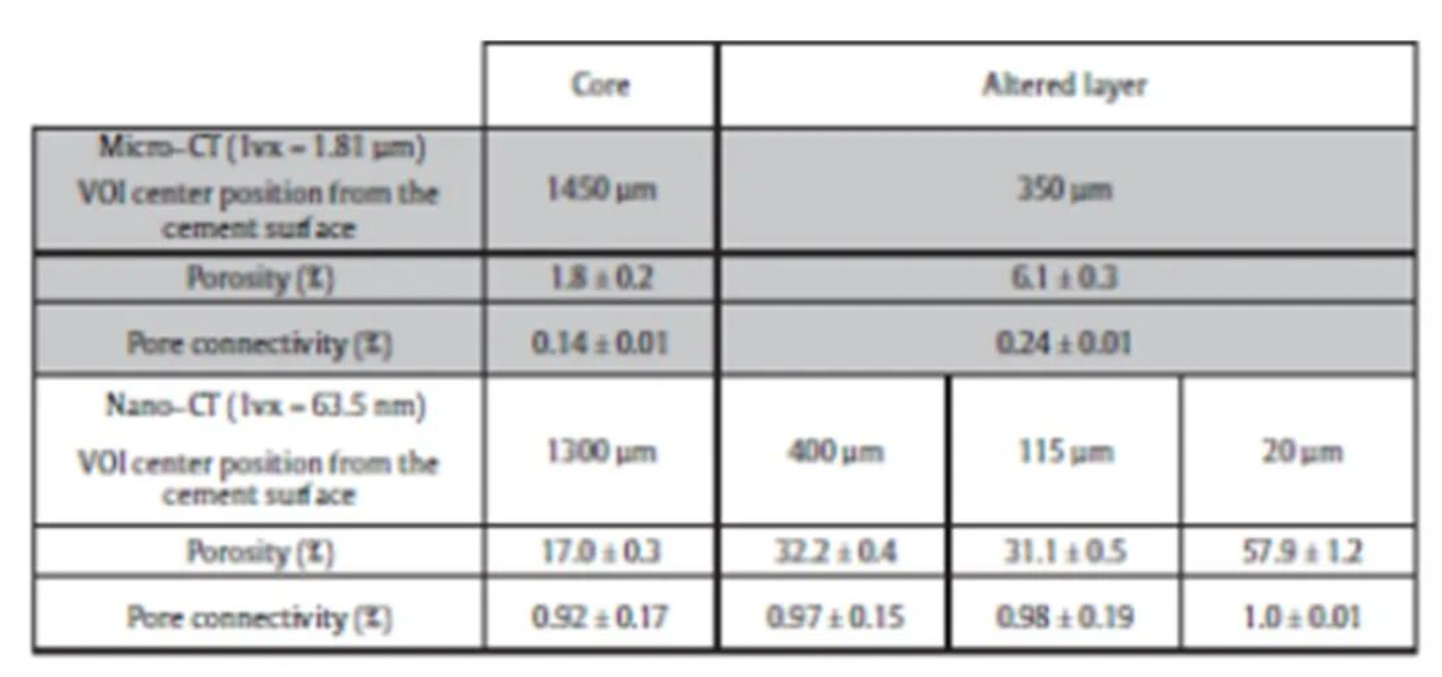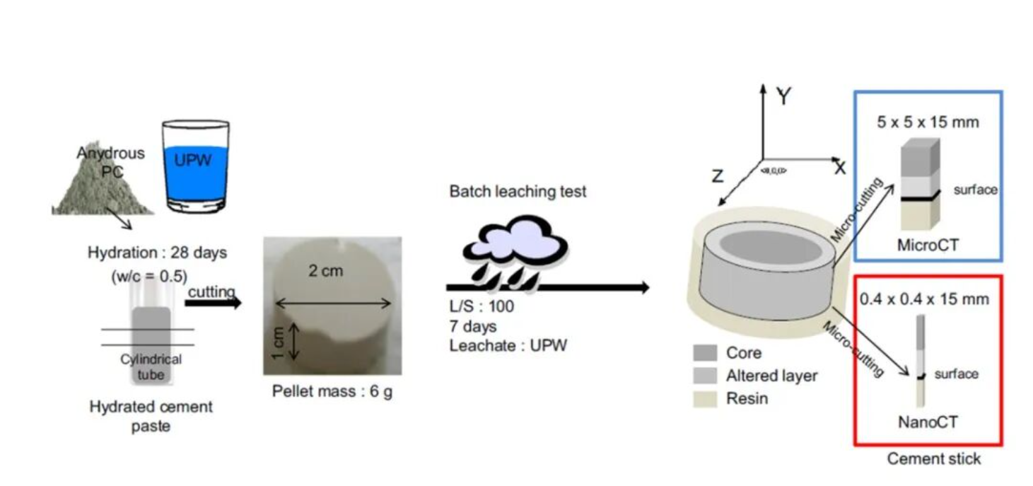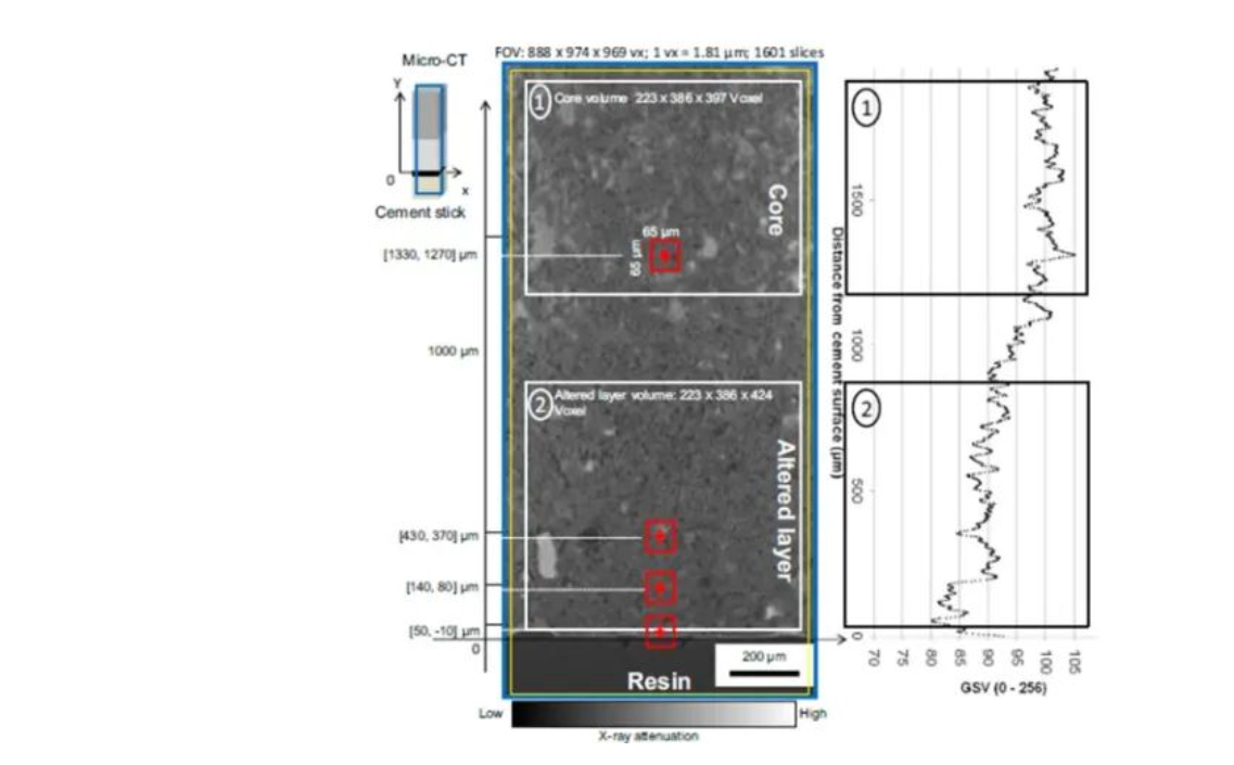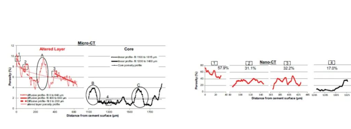 通过结合微米级(Versa)和纳米级(Ultra)X射线三维成像技术,从纳米尺度到微米尺度多尺度表征浸出水泥浆的孔隙结构异质性,揭示了其从核心到表面蚀变层的孔隙率梯度、孔隙连通性及孔径分布变化,克服了传统方法无法三维表征孔隙连通性和空间异质性的局限性。