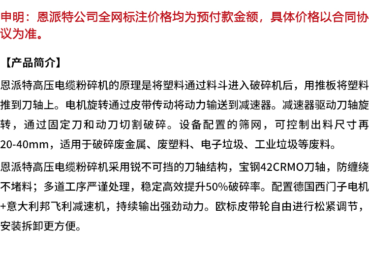 恩派特高压电缆粉碎机 废铜线破碎机 出料尺寸可控