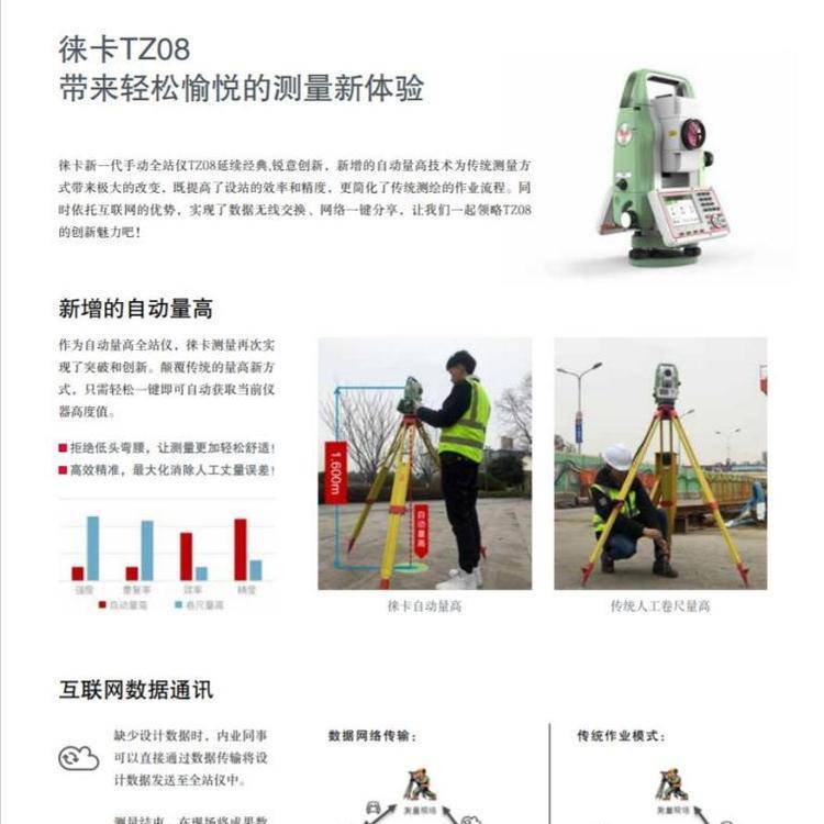 徕卡新一代手动全站仪TZ08延续经典,锐意创新,全球首创的自动量高技术为传 统测量方式带来极大的改变,既提高了设站的效率和精度,更简化了传统测绘的 作业流程。同时依托互联网的优势,实现了数据无线交换、网络一键分享,让我 们一起领略TZ08的创新魅力吧!
