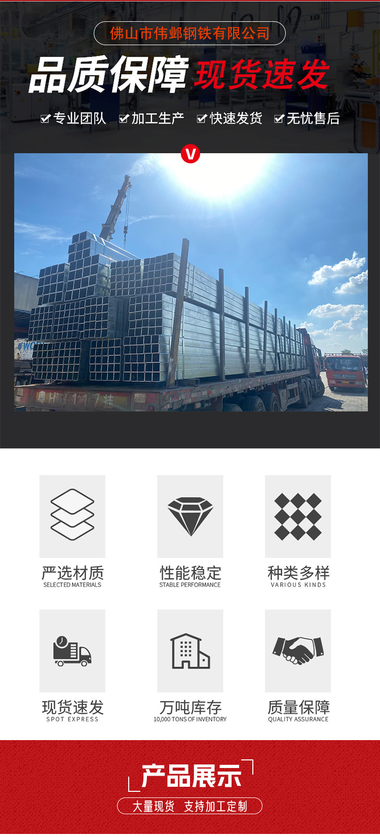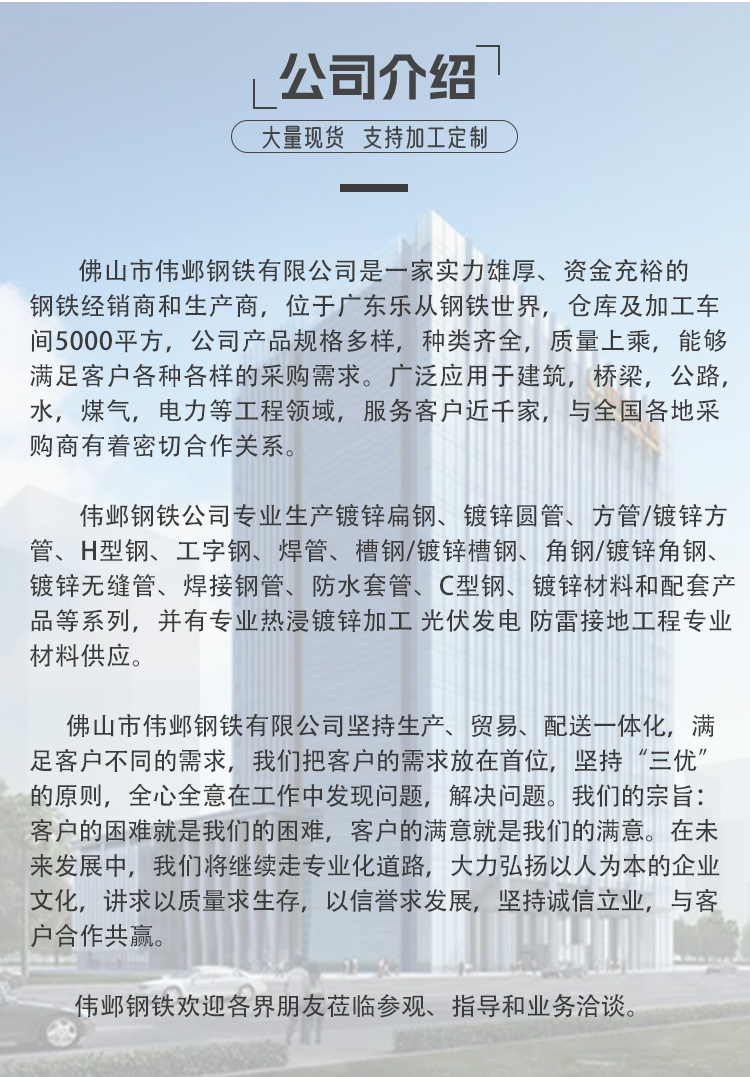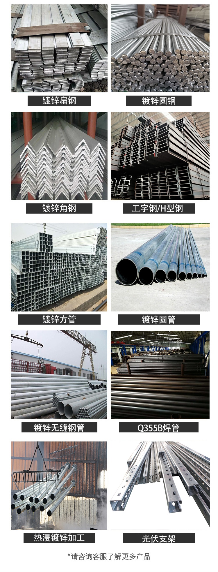 镀锌钢管、镀锌角钢、热镀锌方管、光伏支架、螺旋钢管、球墨铸铁管、无缝钢管、圆钢、扁钢、工字钢、钢板、槽钢、钢管、钢格板、钢材、钢铁、声测管、镀锌管、彩钢瓦、钢结构、h型钢、热镀锌钢管、5mm镀锌钢板、给水管管材、钢塑复合管