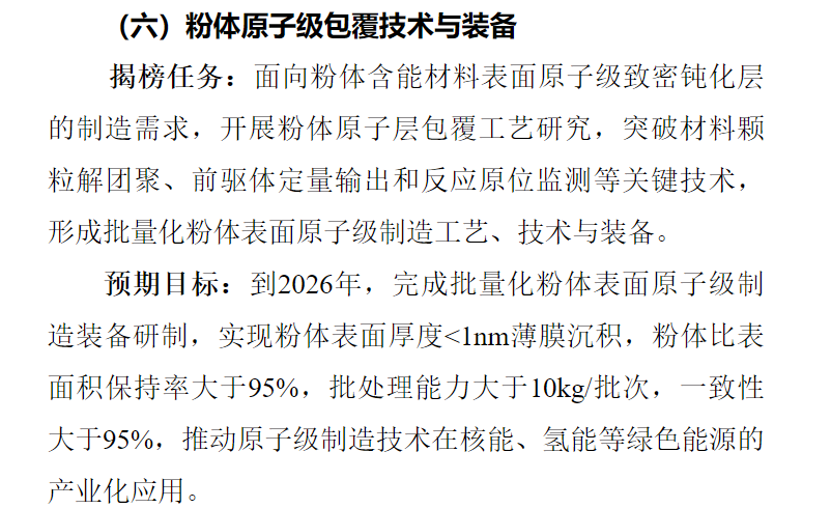 工业和信息化部在《原子级制造揭榜挂帅任务榜单》将“粉体原子级包覆技术与装备”列为重点攻关方向,明确提出“到 2026 年实现 < 1nm 薄膜沉积、批处理能力 >10kg/批次”的目标,直指行业痛点。粉体原子层沉积(ALD)技术,凭借其原子级精度、三维均匀包覆与工艺可扩展性,成为破局关键。