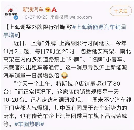 今年 11 月 2 日起,每日早七点至晚八点,包括延安高架、南北高架在内的多条道路禁止“外牌”、“临牌”小客车、未载客的出租车等通行。因为新能源汽车车牌较容易获得,不少人转投新能源汽车,因此带动了新能源汽车的销量,让新能源又小火了一把。