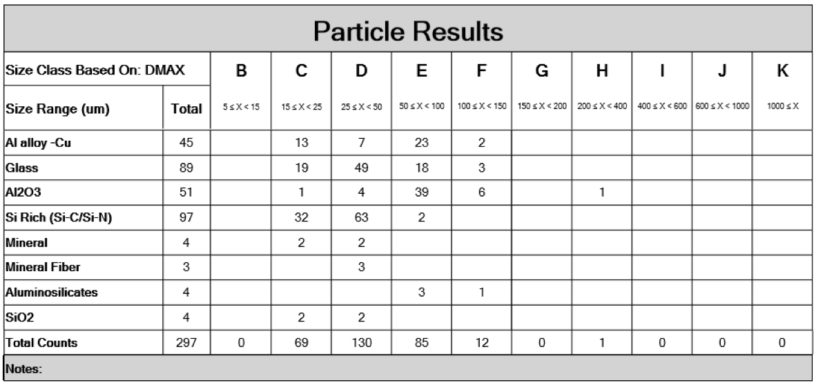 此外,还可将不同的颗粒按成分及数量进行分级,对应 Class B-K 等级,帮助工程师更好的判断产品的清洁程度。如电池中 Cu,Fe 等金属及其氧化物等硬质杂质,若数量过多或尺寸过大,对材料的寿命会有较大影响。通过分级归类,各级供应商可判断材料是否符合要求。