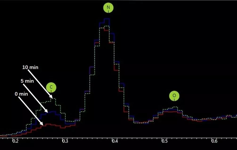 如下图所示,先对样品某区域进行能谱分析,5、10 分钟后再对该区域能谱分析,发现碳元素特征 X 射线峰会升高。