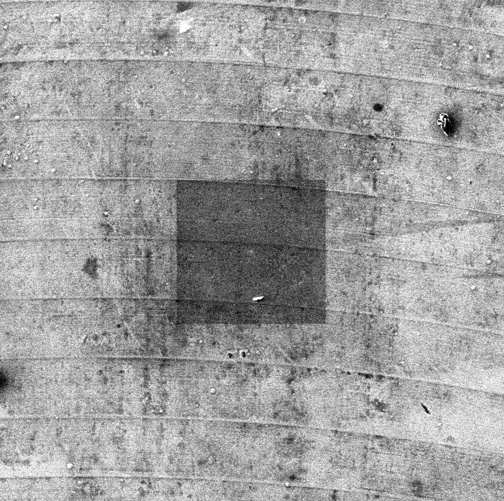 如下图所示,对一块空白的铝制样品台进行观察时,一段时间后降低放大倍数,发现图像中间有一明显的黑色矩形,我们可以简单的称这种现象叫做碳沉积。