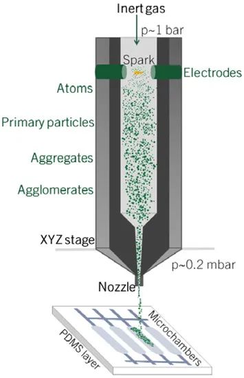 在气流中产生纳米气溶胶后,这些颗粒经低真空环境下的喷嘴加速并通过撞击沉积的方式沉积在多种类型的基材上。沉积的驱动力是沉积室和 VSP-G1 系统(喷嘴上游)之间的压力差。通过 XYZ 载物台控制、显微镜摄像头模块和直观的用户界面可以打印沉积特定的路径,从而可以控制实验参数,进行完全由纳米粒子组成的图案绘制。