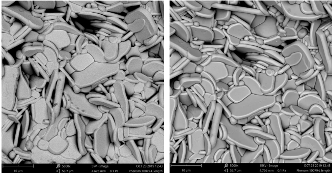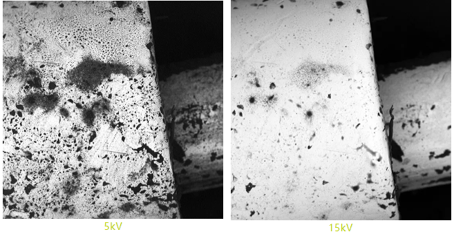 陶瓷在不同加速电压(5kV、15kV)下的两张照片: 加速电压为 5kV 时,可以看到烧结陶瓷的缺陷。