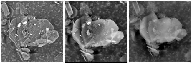 石墨颗粒在不同加速电压(5kV、10kV、15kV)下的三张照片:5kV 时的束流穿透是最弱的,展示了最多的结构信息,具有更好的形貌衬度。