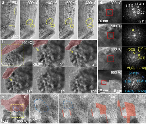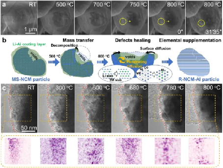 图 5. a. 原位 HRTEM 图像记录了从室温到 600 ℃ 时铝包覆层迁移到 NCM523 颗粒裂缝的过程;b. 原位 HRTEM 图像反映了 800 ℃ 时 NCM523 晶粒中补充铝的扩散过程;c. 原位 HRTEM 图像展示了 NCM523 颗粒的表面空位的热愈合过程。