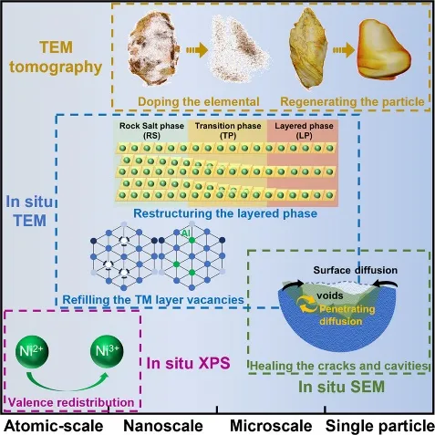 对于废弃锂离子电池的退化正极材料的直接再生利用是一种环境可持续、且性价比较高的“变废为宝”策略。然而,微观层面的再生机制和相应过程的动力学仍旧处于未知状态。该工作中,研究者们试图通过多种方法展现了退化 NCM523 材料的再生机制。并使用了一系列的原位(TEM、SEM、同步辐射 XPS)、非原位(TEM 重构、EDS 重构、电化学测量)表征技术建立了 NCM523 再生机制的完整物理化学图像。之后从原子尺度、纳米尺度、微米尺度直至单颗粒水平,对包括岩盐相到层状相的逆转变、缺陷(空洞、裂纹)愈合、金属离子的价态转变在内的重要动力学细节进行了讨论。最后,通过系统性的理论分析和全电池电化学测试对上述细节进行了补充讨论。该研究为退化正极材料的直接再生利用提供了深入的理解,对将来开发和优化电池材料的再生策略具有启发意义。