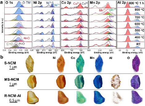 图 3. a. MS-NCM 样品烧结时,氧1s、镍2p、锰2p、铝2p的原位同步辐射 XPS 谱;b. NCM523 颗粒的 3D 透射电镜重构图,以及对应的镍、钴、锰、铝、氧元素的能谱重构图。