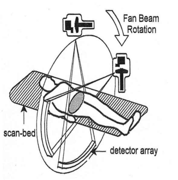 医用 CT:射线源和探测器绕人体旋转