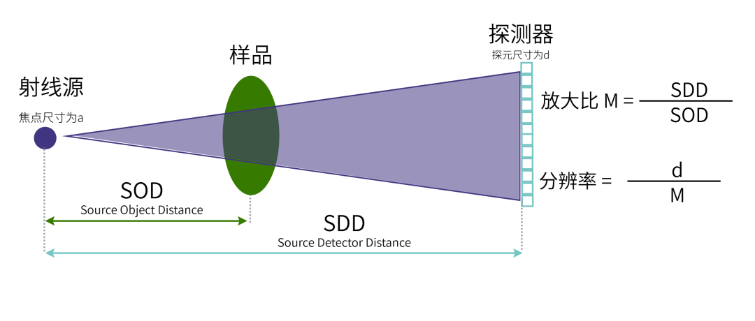 样品尺寸的不同也直接影响了成像分辨率,如下图所示,射线源到样品中心的距离为 SOD,射线源到探测器的距离为 SDD,则放大比 M=SOD/SDD;此外探元尺寸为 d,则分辨率=d/M;由此可知,样品尺寸影响 SOD,从影响分辨率,即样品尺寸越小,分辨率越高。