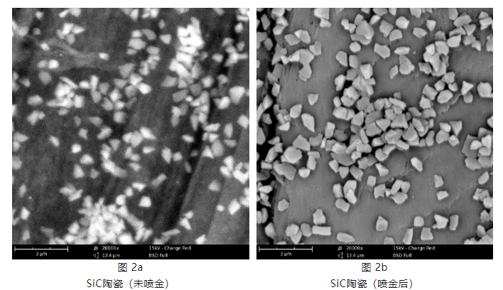 如图 2 所示,样品是 SiC 陶瓷。未喷金时,图像的信噪比较差,可以看到许多明显的噪点,不利于聚焦等操作,无法获得高质量的图像;喷金以后,图像质量明显提升。