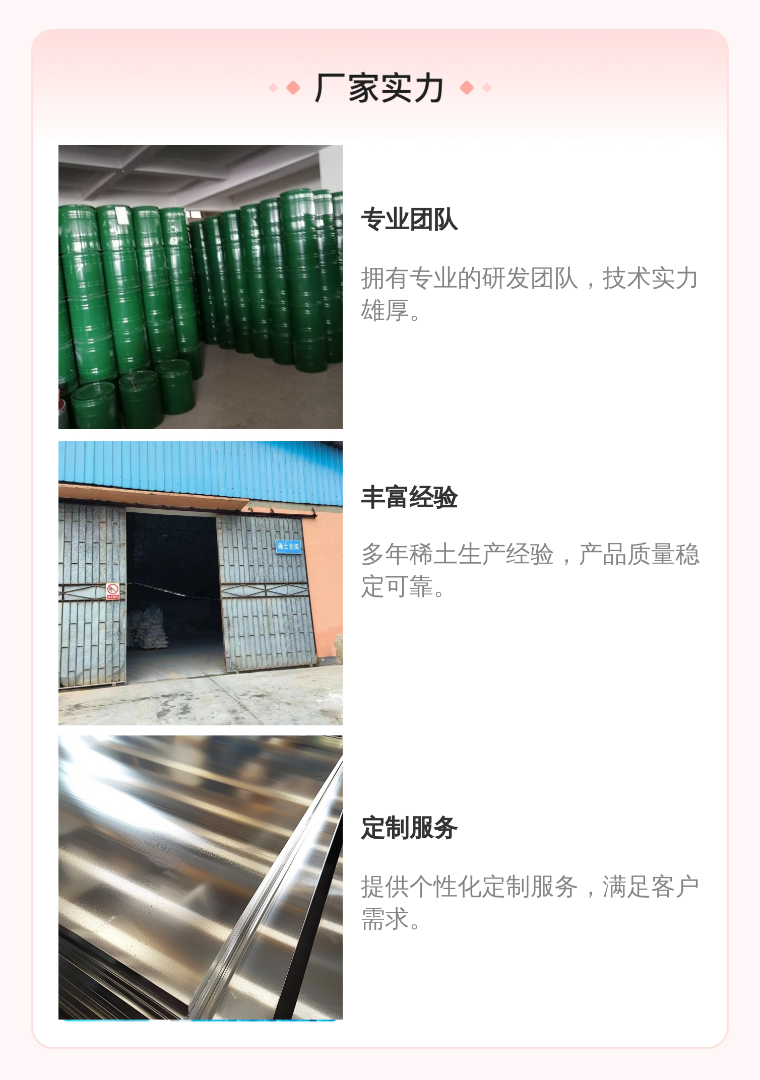 金属镧、氧化钇、金属铈、金属镝、金属镨锭、稀土氧化、铝锂金属、镧铈合金、稀土金属、铝镱金属、铜铈合金、氧化镱粉、镁钕合金、镁铈合金、镁镝合金、铜镧合金、镁铒金属、镁钇合金、高纯氧化镧、高纯度氧化铈、镁镧中间合金、铝钇合金金属、高纯金属钐锭、稀土紫色氧化钕