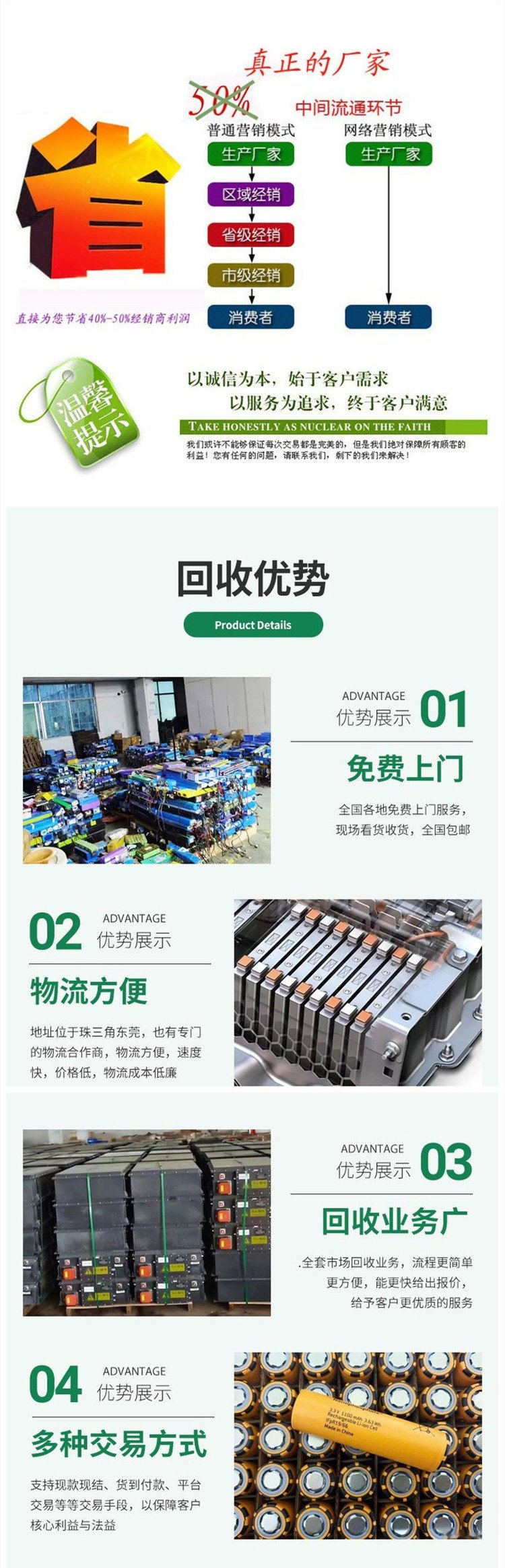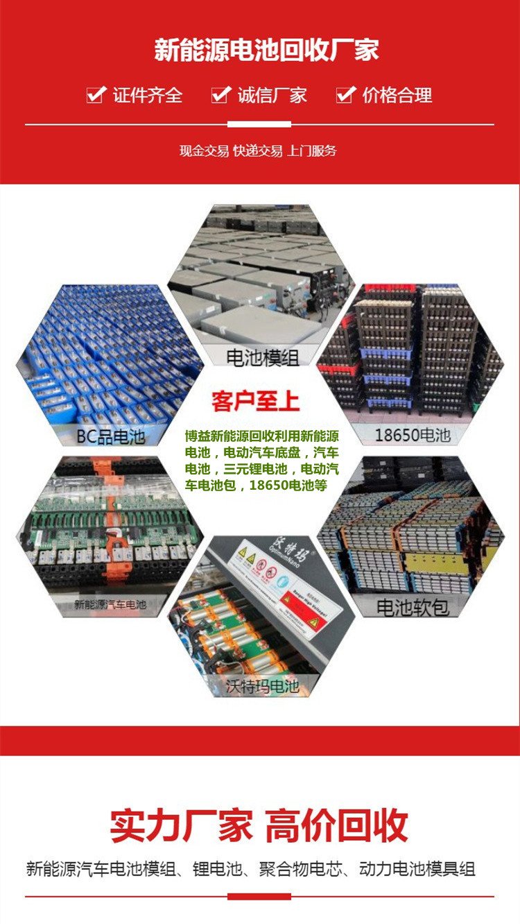 本公司大量回收汽车退役底盘电池包,电动车锂电池,库存B品锂电池,新能源汽车锂电池时空模组电池包,动力电池,大单体铝壳电池,圆柱形电池,方形电池,铝壳电池,聚合物电池,软包装电池,钛酸锂电池,磷酸铁锂电池,钴酸锂电池,银隆电池,高倍率电池,进口原包装18650电池,电动工具电池包,割草机电池模组电池,库存品AB品锂电池,进口聚合物电池,宁德锂电池,航模电池,103450电池,14500电池,高倍率18650电池,32650电池,21700电池,26980电池,32700电池,圆柱型聚合物电池,黑皮进口聚合物电池,三洋18650电池,LG18650电池,松下18650电池,索尼18650电池,三星聚合物电池,手机电池保护板,笔记本电池保护板,锂电池正负极片回收,鈷粉等回收,恪守诚信为本的原则,本公司以价优为基础,公平求生存,信誉作保证