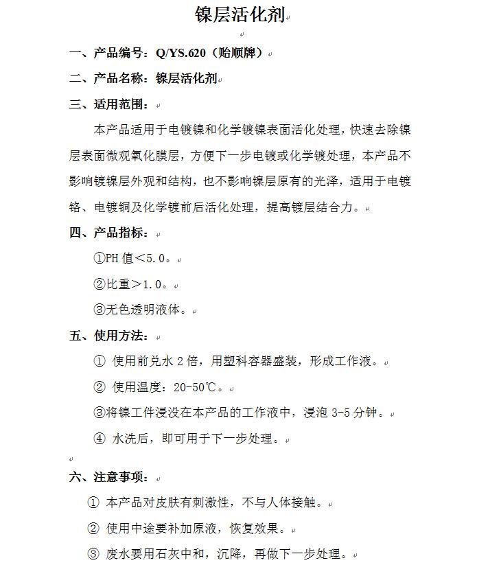 Q/YS.620贻顺牌 镍层活化剂 化学镀镍表面活化处理