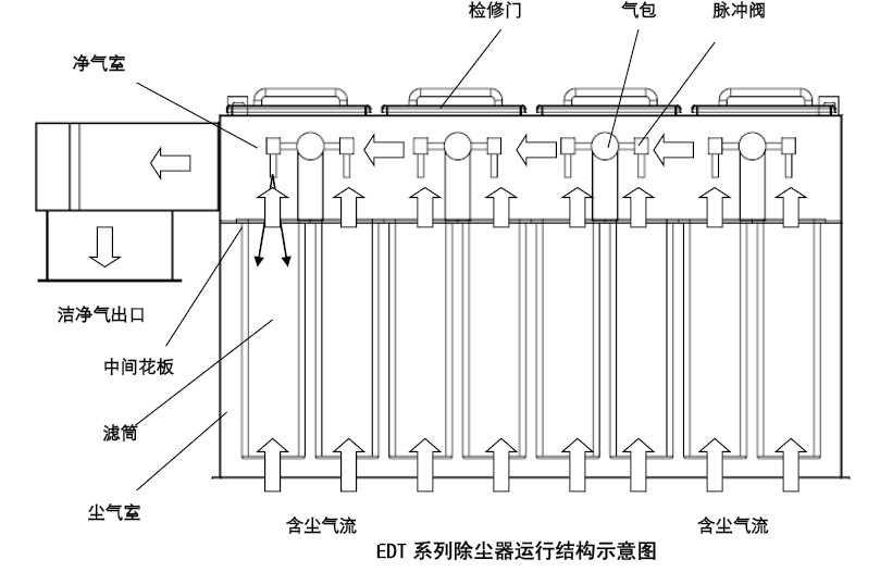 清灰时每组滤芯自动及顺序地进行清灰,在设定时间内每组仅有一组滤芯进行在线清灰。在滤芯清灰过程中,定时控制器接通一只电磁阀的电源,使相应的隔膜阀喷出脉冲高压空气,后者即从内到外穿过滤芯,将附着在滤芯表面上的粉尘除去,尘粒落入尘斗,然后进入集灰桶。